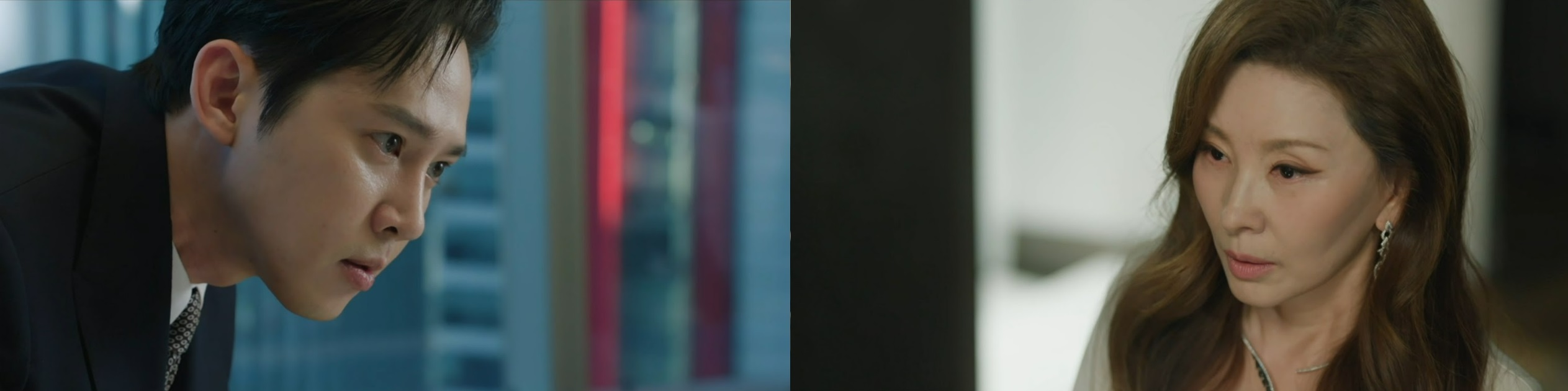 역시 한국에 돌아온 윤은성은 곧장 모슬희를 찾아가 독일 차사고에 대해 따졌습니다. 모슬희는 눈하나 깜빡 않고 인정하며, 아들에게 앞으로도 본인의 목적을 사수하기 위해 어떠한 일도 감행할 수 있다고 협박합니다. 그러자 이번에는 아들이 어머니를 협박하기 시작했습니다. 초반부에 홍만대 회장 방에 선물한 거대한 나폴레옹 액자에 CCTV를 설치해 놓아, 모슬희가 홍만대 회장에게 몹쓸 짓을 한 것이 모두 영상으로 남아 있었던 것이었습니다. 용호상박... 정말 살벌한 모자네요.