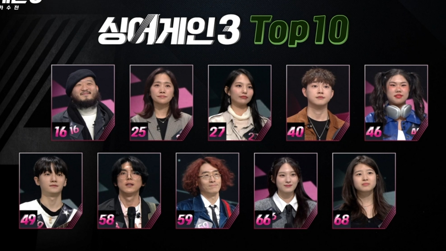 지난 시간에 Top10 진출을 확정한 16호, 25호, 27호, 30호, 46호, 49호, 58호, 66호 8인 이외에 폐자부활전을 통해 59호님과 68호님이 최종 Top10에 이름을 올렸습니다. 각 진출자의 이름은 16호님은 호림, 25호님 강성희, 27호님은 임지수, 40호님은 채보훈, 46호님은 신해솔, 49호님은 소수빈, 58호님은 홍이삭, 59호님은 추승엽, 66호님은 이젤, 68호님은 리진입니다. 앞으로는 본인의 이름으로 경연에 참여하게 되었습니다. 이번 오디션을 통해 본인의 이름을 다시 찾으신 분들께 응원을 보냅니다.