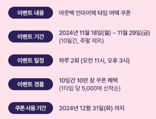 연말을 맞아 아웃백에서 선착순 쿠폰 이벤트를 시작했습니다. '아웃백 인마이백 타임어택'이라는 이벤트로, 11월 18일부터 11월 29일까지 2주간 매일 2회씩 5,000장의 쿠폰을 선착순으로 제공할 예정입니다. 오늘은 해당 이벤트 혜택과 자세한 참여 방법에 대해 알아보도록 하겠습니다.